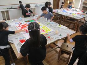 1年生が図工で「ぺったんコロコロ」を行いました。 トイレットペーパーの芯など様々な材料に絵の具をつけて、スタンプをしたり転がしたりして自由に表現していました。 |