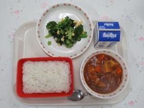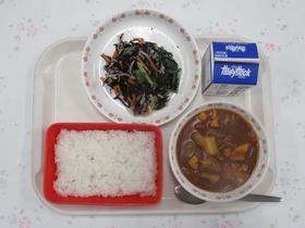 今日の「おはなしめぐり給食」は、「給食番長」の番長カレーと番長のひじきサラダでした。 番長カレーは、りんごピューレとだし汁が入ったいつもと少し違うカレーでした。 |