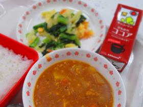 食物アレルギーの人達でも食べられる献立でした。 牛乳の代わりに豆乳、アレルゲンフリーのカレールウを使ったチキンカレーが登場しました。 |